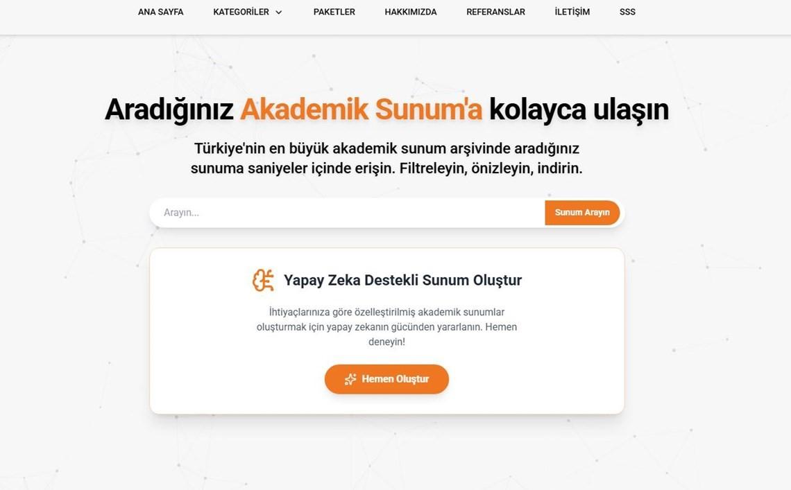 Akademik Sunum, öğrenciler ve akademisyenler için sunum hazırlama sürecini kolaylaştıran, yapay zekâ destekli bir dijital içerik platformudur. Kullanıcı dostu ara yüzü sayesinde, sunum hazırlamak isteyen herkes saniyeler içinde ihtiyacına uygun içeriklere ulaşabilir. Sistem; tez sunumları, makale sunumları ve ders izlenceleri gibi birçok farklı türde akademik sunum şablonları ve içerikler sunar.
