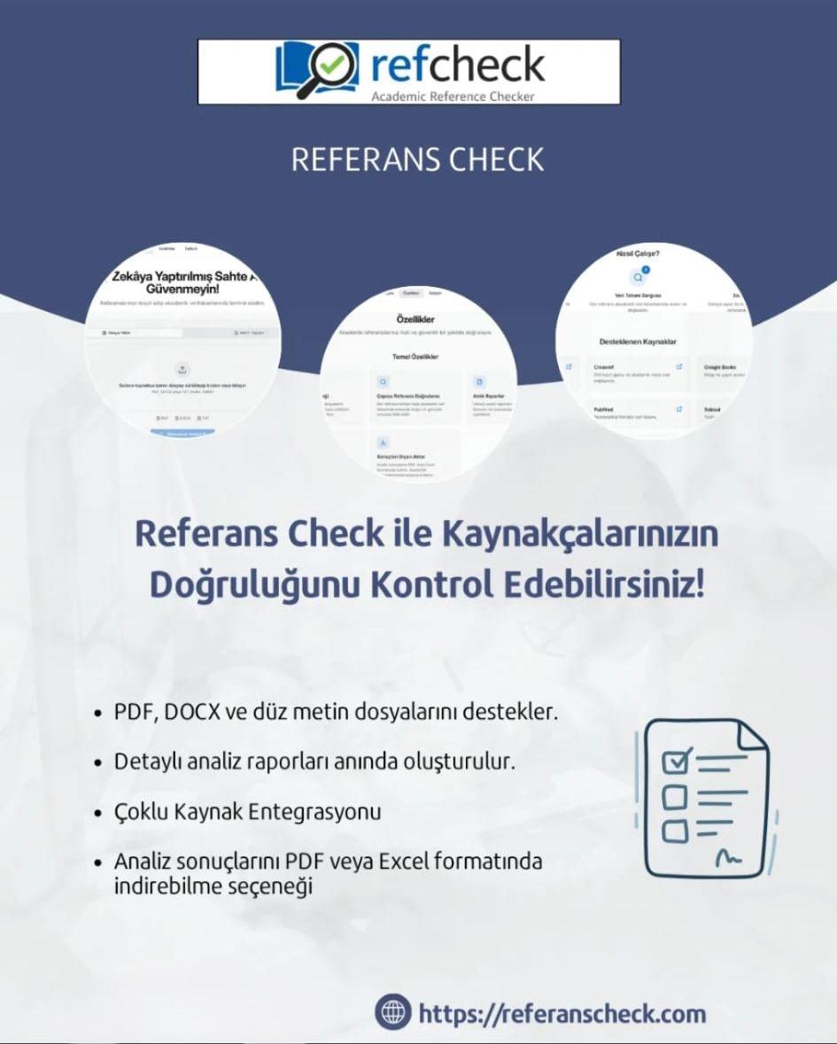 Referans Check, akademik metinlerde yer alan kaynakçaları otomatik olarak analiz eden ve kaynakça güvenliğini ve doğruluğunu (yapay zekaya yaptırılıp yaptırılmadığı, atıf bilgisinin doğru verilip verilmediği) kontrol eden bir referans kontrol aracıdır. Akademik referanslarınız, birden fazla ulusal ve uluslararası akademik veri tabanında çapraz olarak kontrol edilir. Bulunan ve doğrulanamayan referanslar açıkça raporlanır.